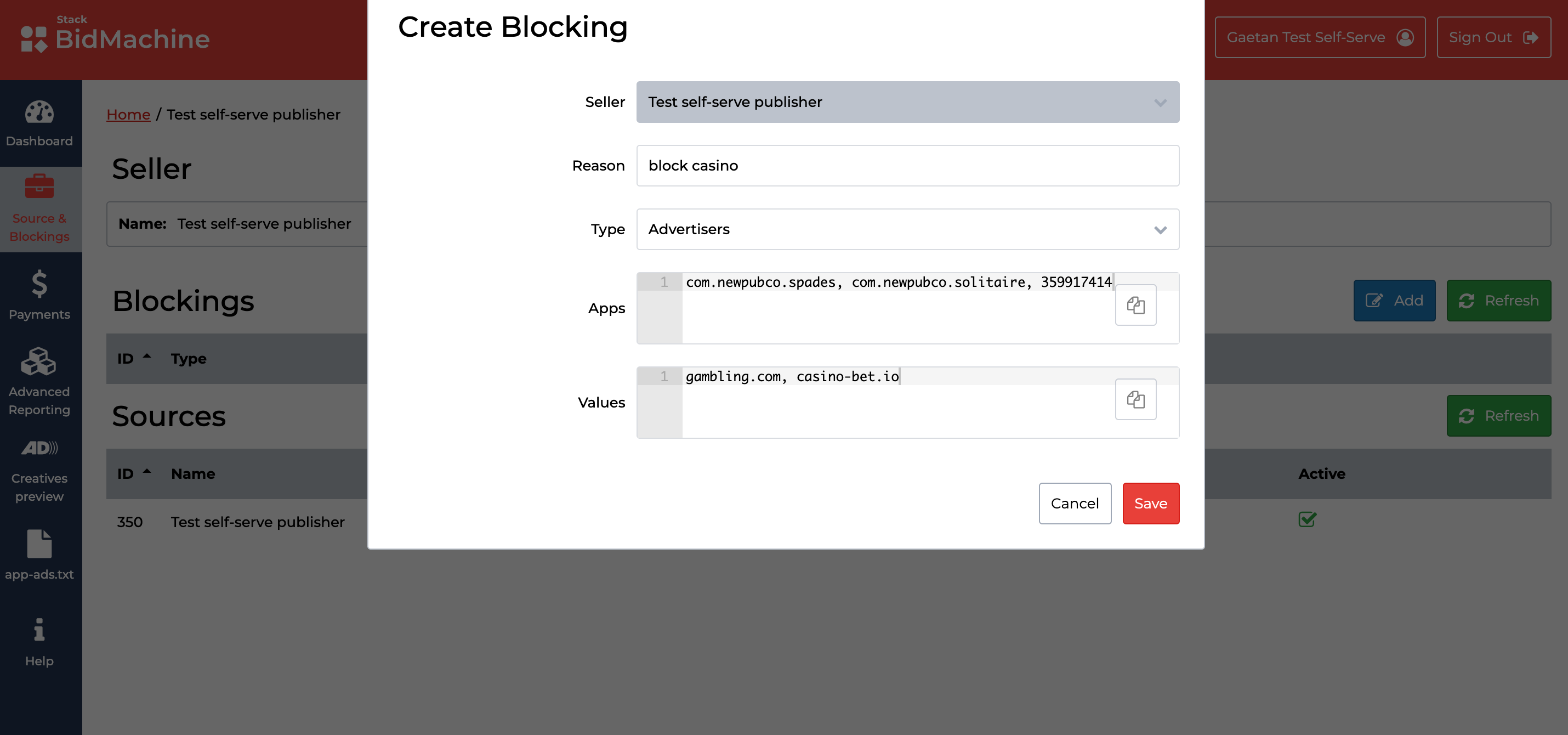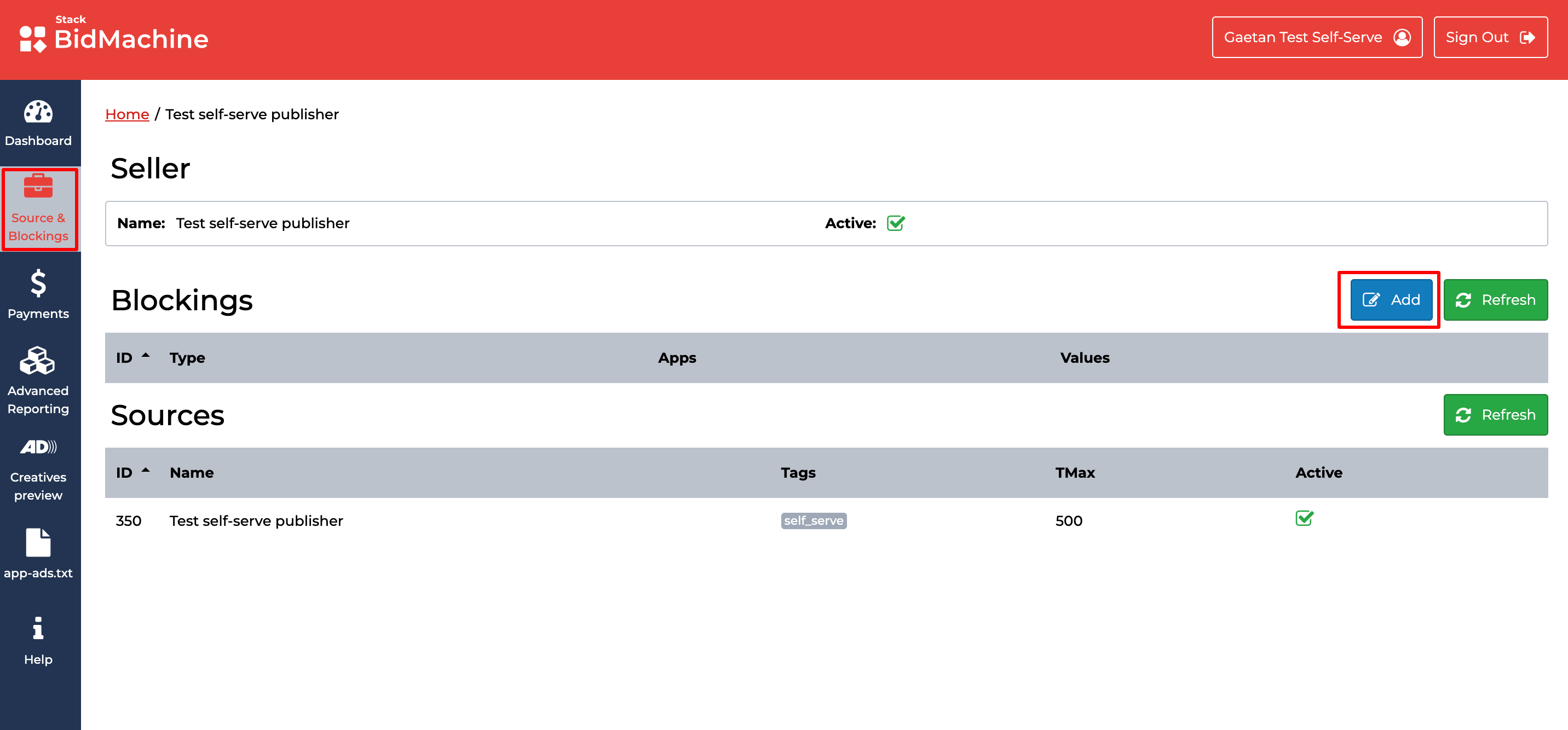 - In the BidMachine dashboard, go to Source & Blocking Rules.