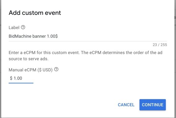 Regular BidMachine waterfall integration. It requires adding specific Custom Events for selected Mediation Group.