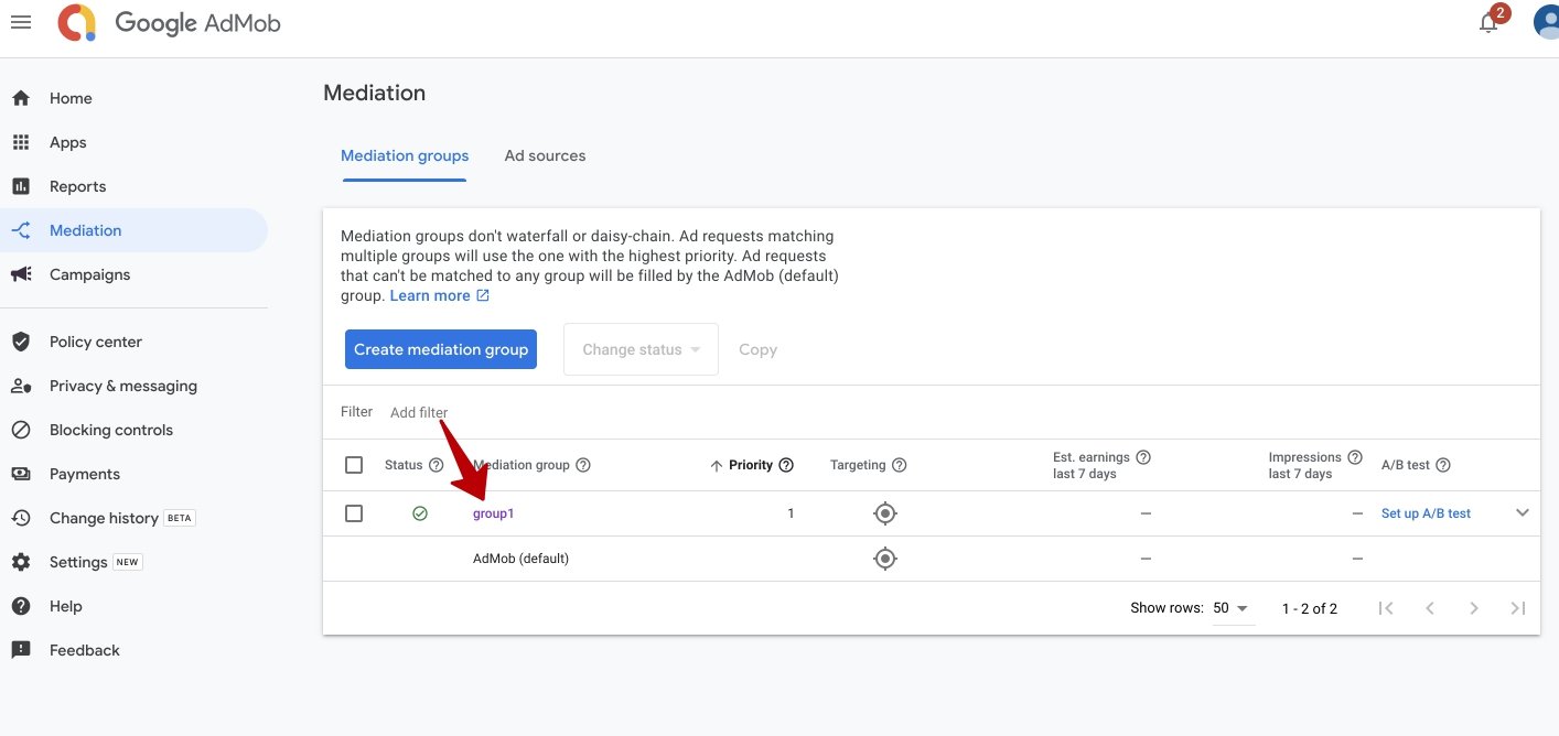 Go to Google AdMob dashboard and choose mediation group where you want to create BidMachine ad sources.