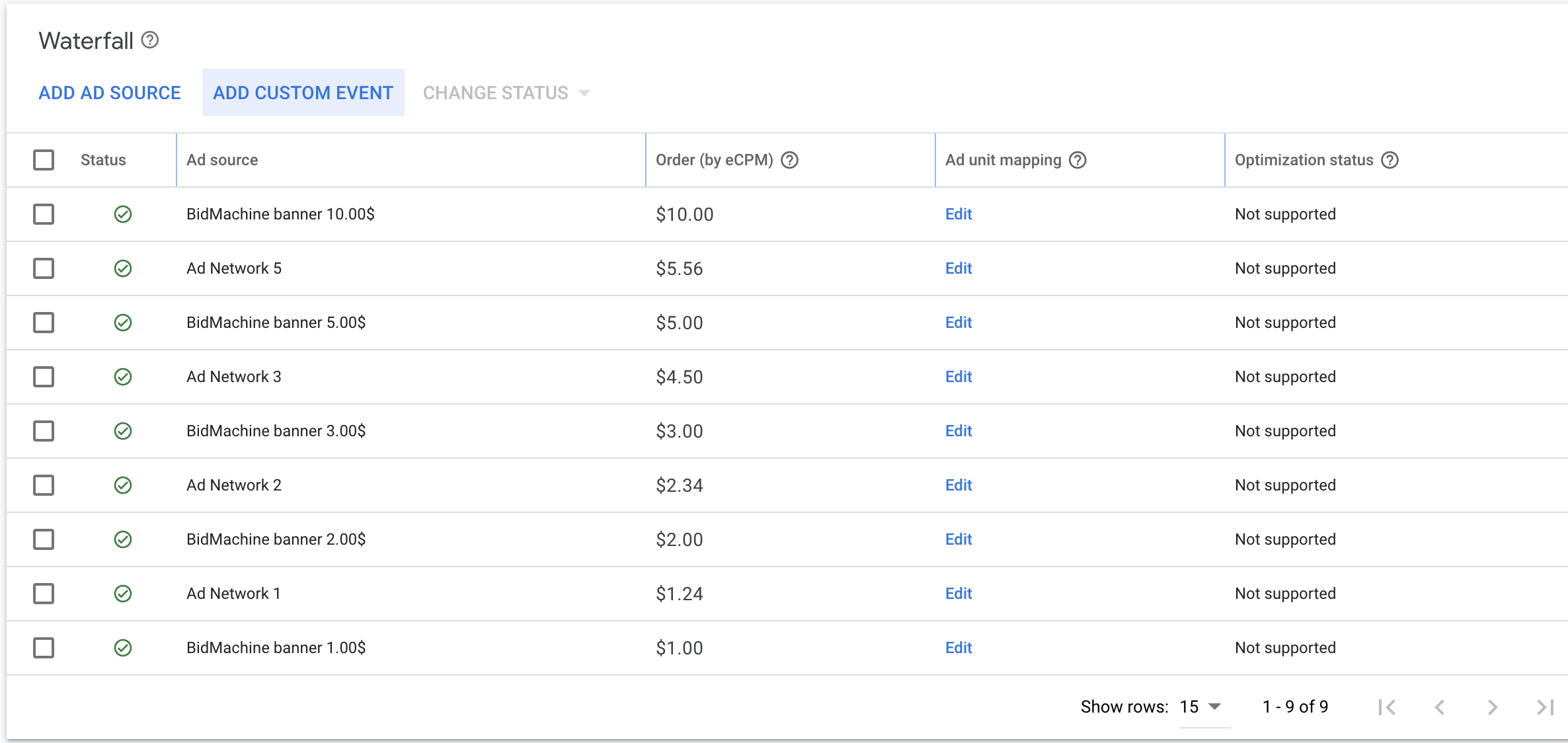 You can create several ad sources within same mediation group. Once you are done with creating them - you should see final waterfall with your networks and newly created BidMachine ad sources.