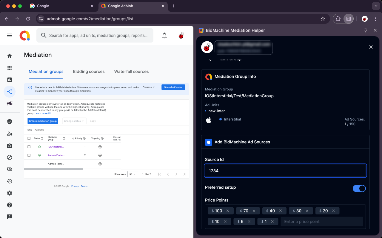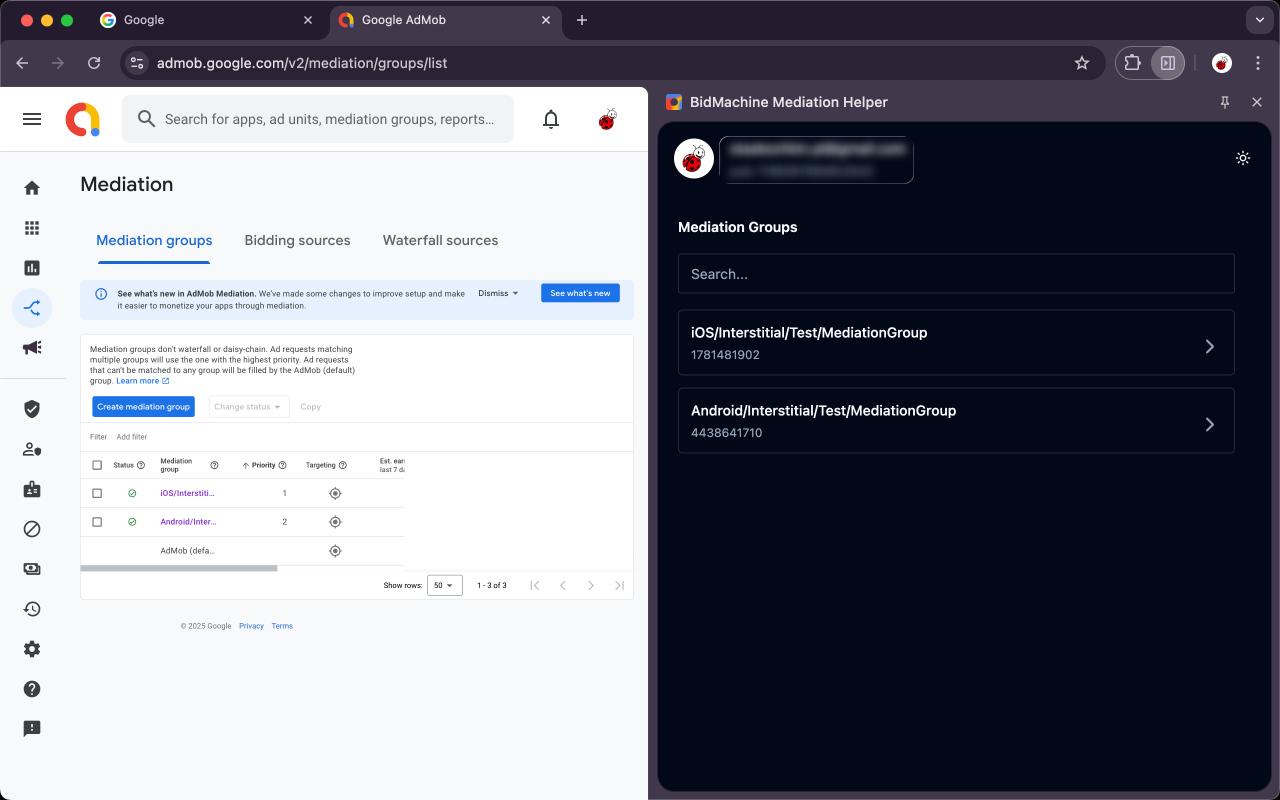 Open the extension and go to the Google AdMob dashboard. The extension will detect your account and find mediation groups associated with it.